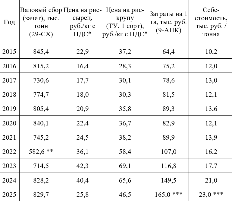 Однако рекордные показатели урожайности не особо радуют рисоводов, так как в настоящее время цены на рис-сырец и рис-крупу снижаются обратно пропорционально росту затрат на выращивание риса. Так, в феврале 2025 года цена продажи риса была 30,5 руб./кг на сырец и 54,6 руб./кг на крупу, а по состоянию на начало февраля текущего года - 19,7 руб./кг и 38,0 руб./кг соответственно, то есть по сырцу на 35% меньше. По итогам финансового 2025 года ожидается рост затрат на производство риса не менее, чем на 10 - 15% к уровню предшествующего года и, по предварительной оценке, достигнет значения 160 - 170 тыс. руб. на 1 гектар, при себестоимости 21 - 23 руб./кг.