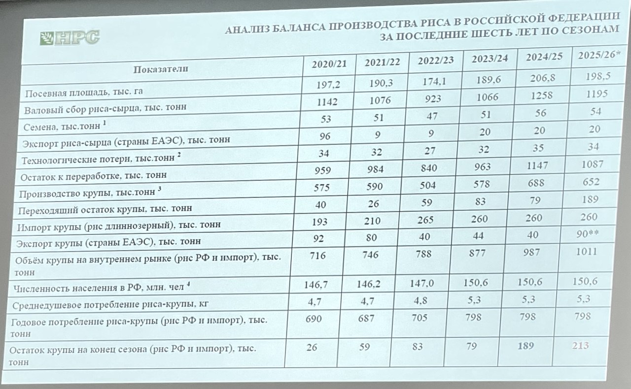 В сентябре 2025 года остатки риса-сырца и рисовой крупы (в пересчёте на сырец) в Краснодарском крае составляли рекордные 194 тыс. тонн.